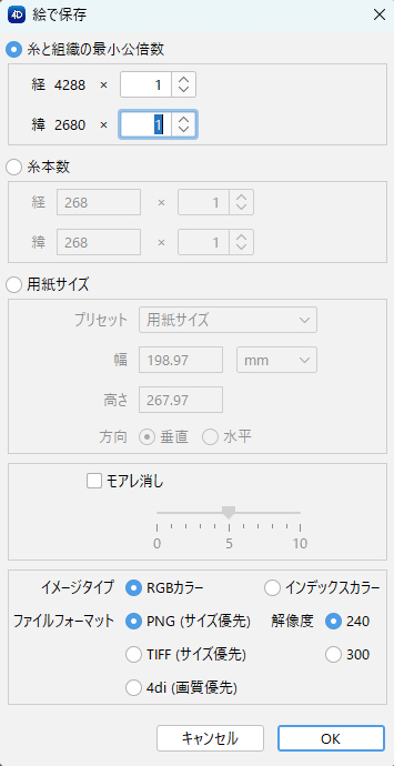 - 絵で保存するサイズ(糸と組織の最小公倍数/糸本数/ 用紙サイズ)を選択します。