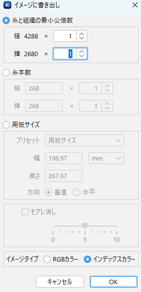 - イメージに書き出しするサイズ(糸と組織の最小公倍数/糸本数/ 用紙サイズ)を選択します。