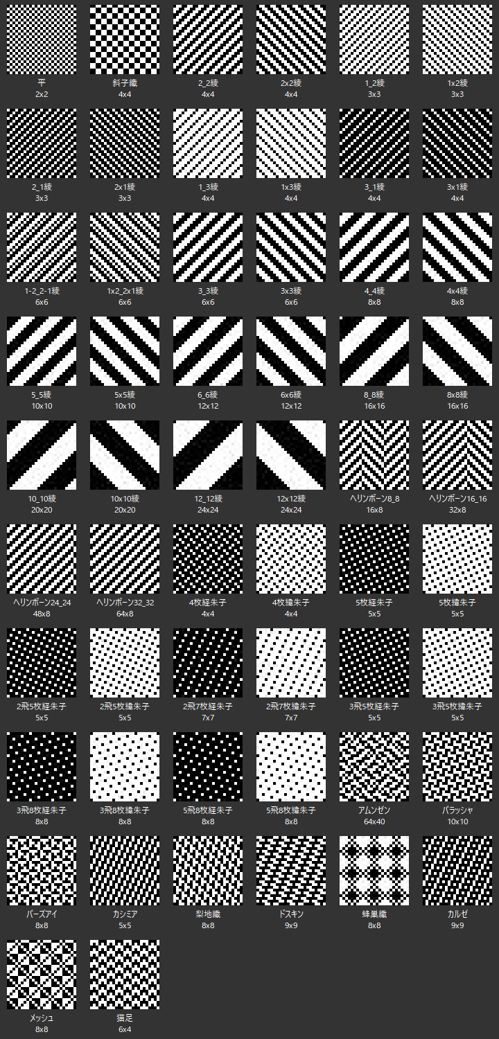 織物組織一覧 2023.06.26 2025.12.05 Weave Basic Weave A Weave B Weave C Weave D Weave E 関連機能 2023.06.26 組織編集(テキスタイル) 組織図の編集画面での操作です。組織を作成し登録します。または組織リストから組織データを呼び出してアレンジします。 組織編集画面 ... 2023.06.26 組織図メニュー 組織編集画面で使用できるメニューです。 【A】 二層組織(またはドビー組織)の作成時に表示されるメニューです。詳細は、二層織り... 2023.06.26 組織合成 登録されている組織を組み合わせてオリジナルの組織を作成します。部分的に組織を変更したい場合などに有効です。 動画はこちら 組...