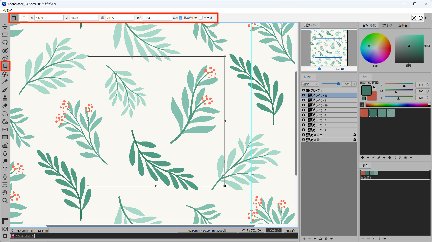 トリミングツールでは、「重なり」を考慮した切り抜きが可能です。カンバスの外側にあったモチーフが削除されずに保持されるため、サイズ変更後もすぐに再レイアウトに移れます。
