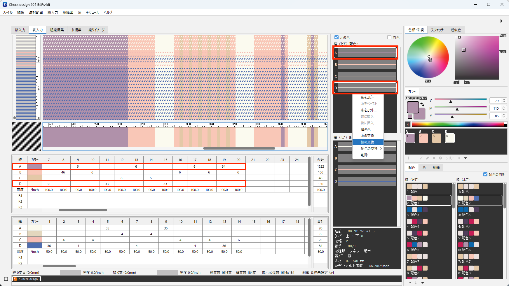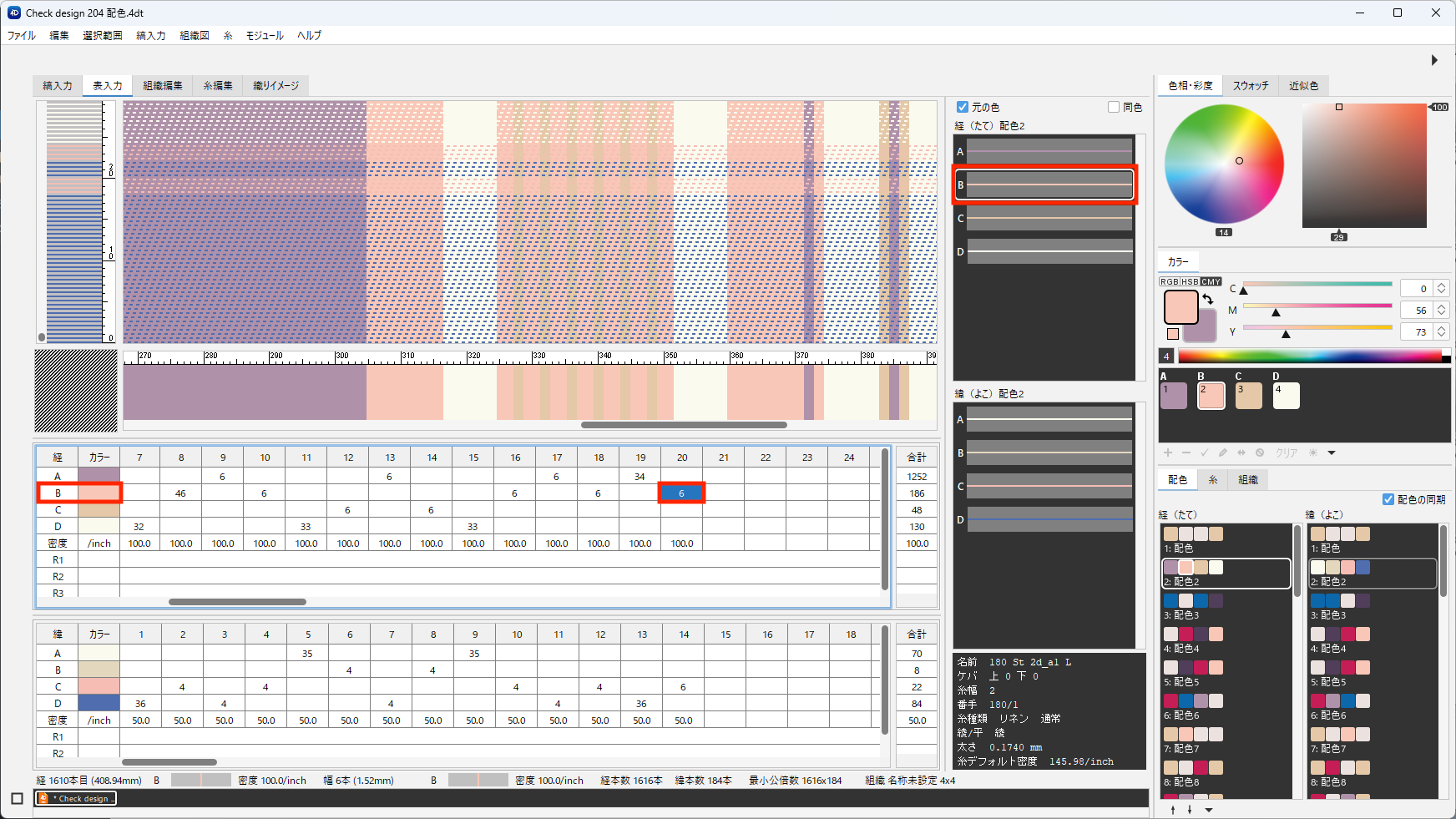糸揃えリストの糸の順序(A、B、C…)が交換された様子は表入力画面でも確認できます。