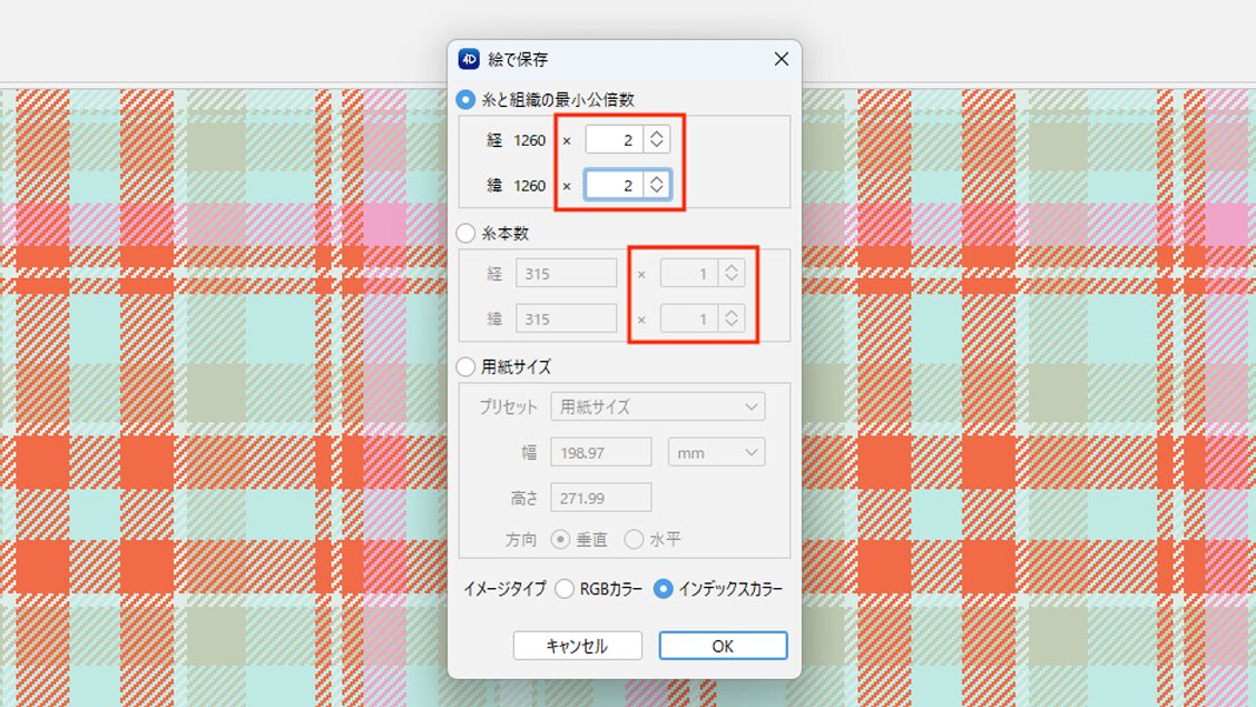 絵で保存とイメージ書き出しで「糸と組織の最小公倍数」と「本数」を選択した時、リピート回数を指定できるようになりました。