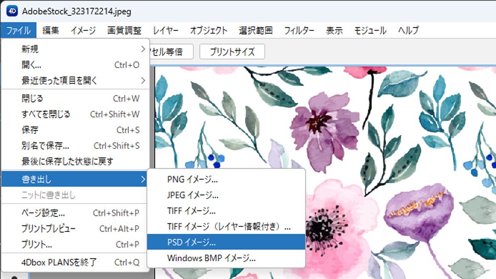 ファイルメニュー>書き出し>PSDイメージ を選択します。