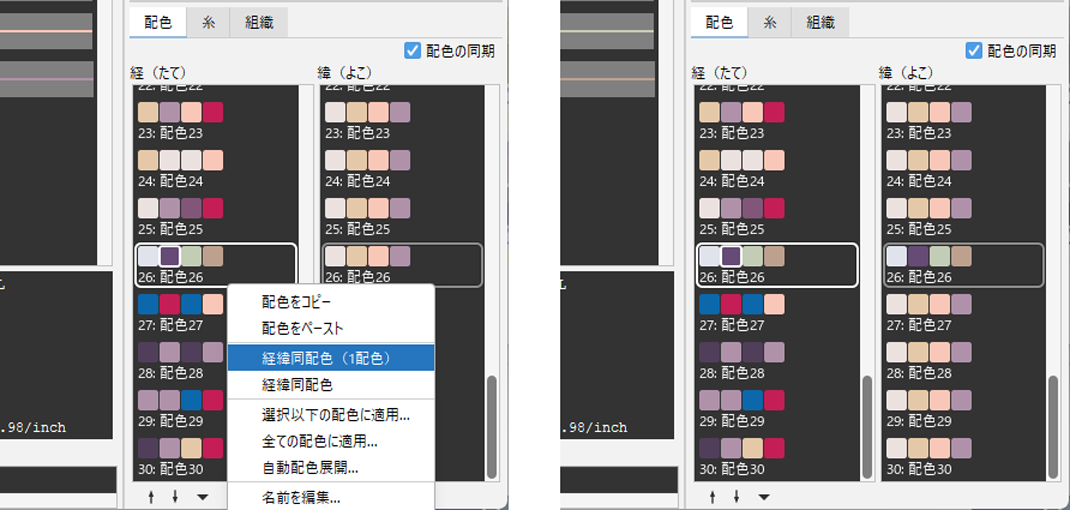 選択している1配色のみを経緯同配色にすることができるようになりました。