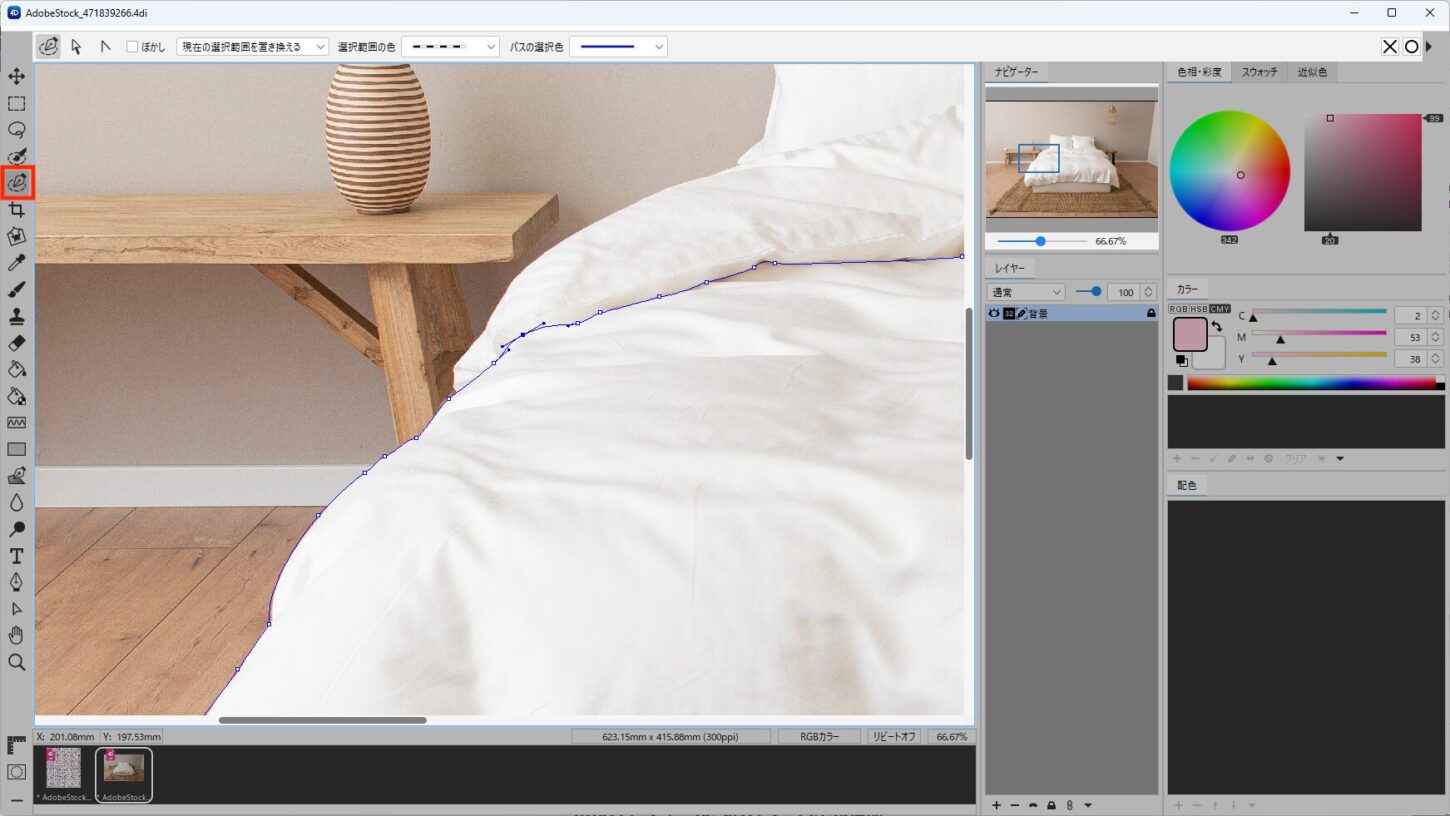 パスを描くような操作感で、自由な形の選択範囲を作成できるようになりました。現在の選択範囲への追加や削除もオプションバーから切り替え可能です。