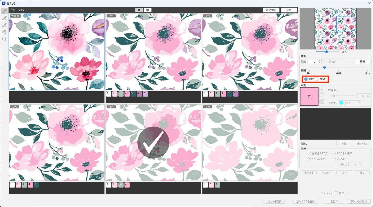 - 色数と(色相の)間隔を調整し、必要な画像をクリックして「✓」マークを入れ、「OK」ボタンをクリックします。