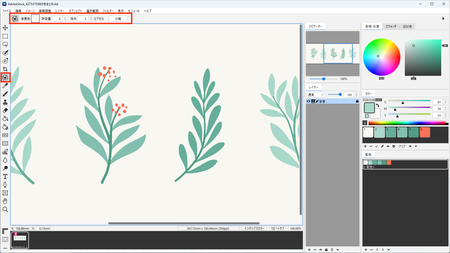 - 画像の背景色にあたる色をクリックして、オプションバーの背景色を設定します。